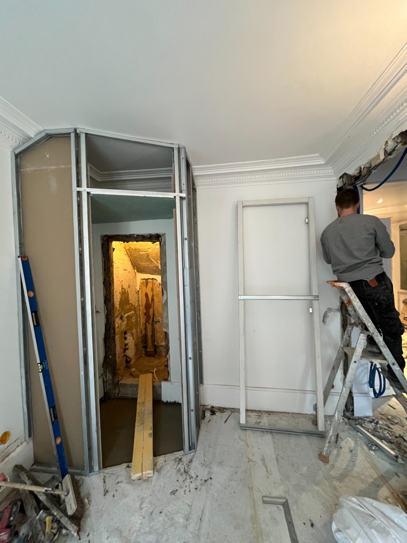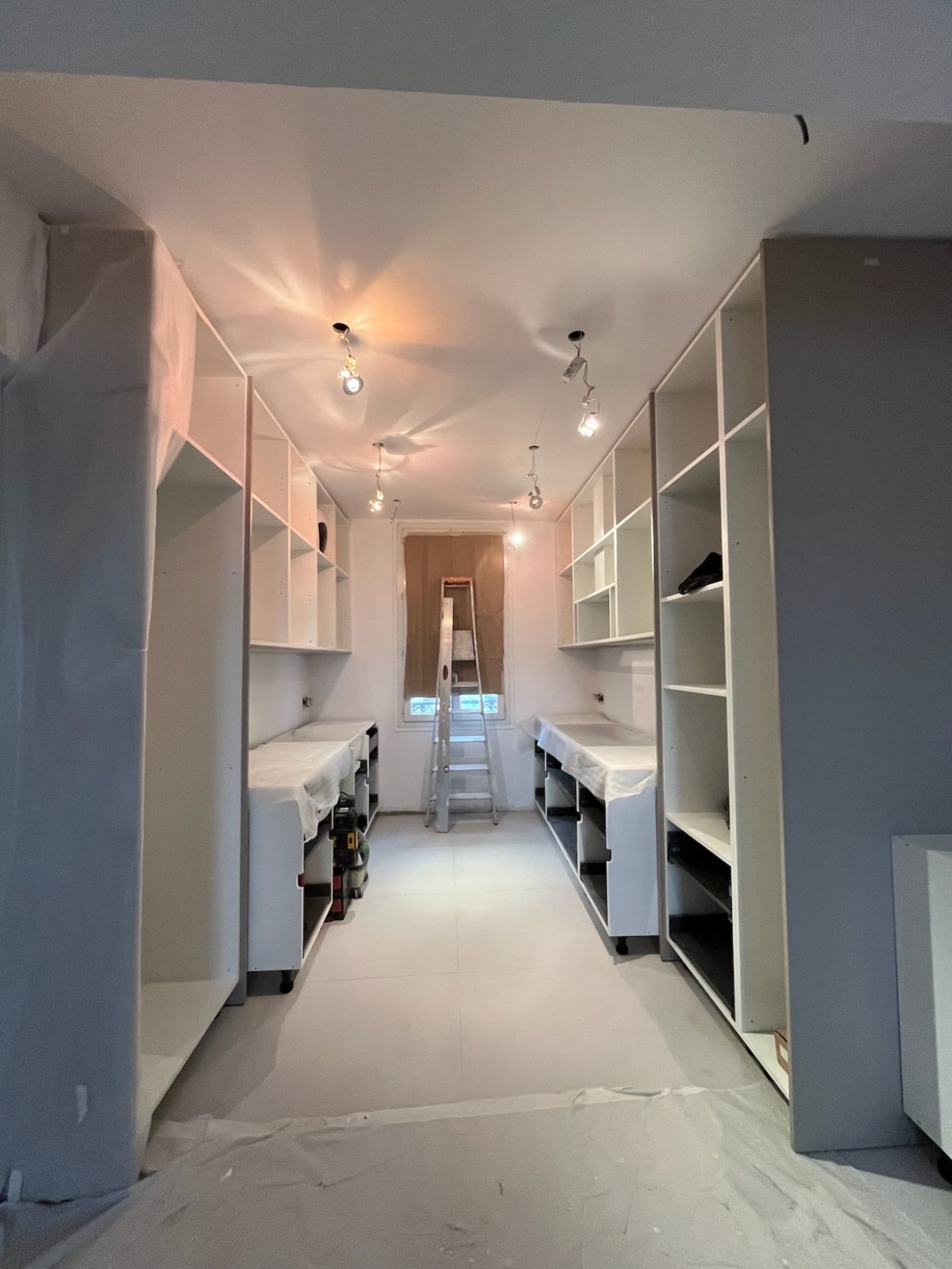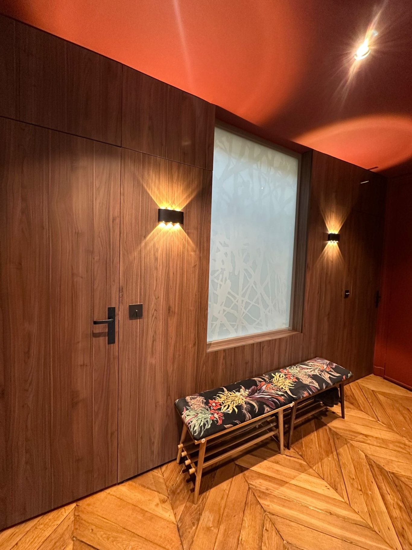 L’intervention consistait à réorganiser un espace de circulation en intégrant, dans un même volume, un accès dissimulé aux toilettes, un couloir et des éléments techniques (radiateurs, conduits, etc.), tout en créant un mur décoratif habillé de noyer, parfaitement intégré à l’ambiance.
