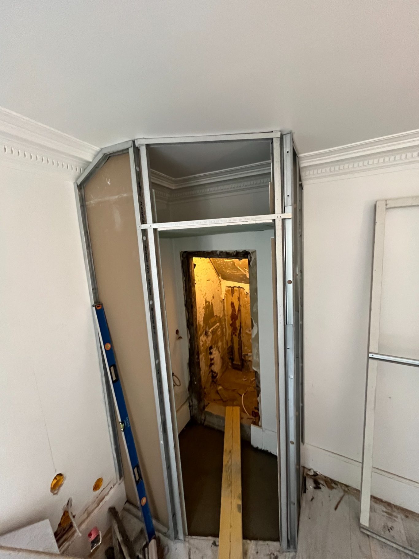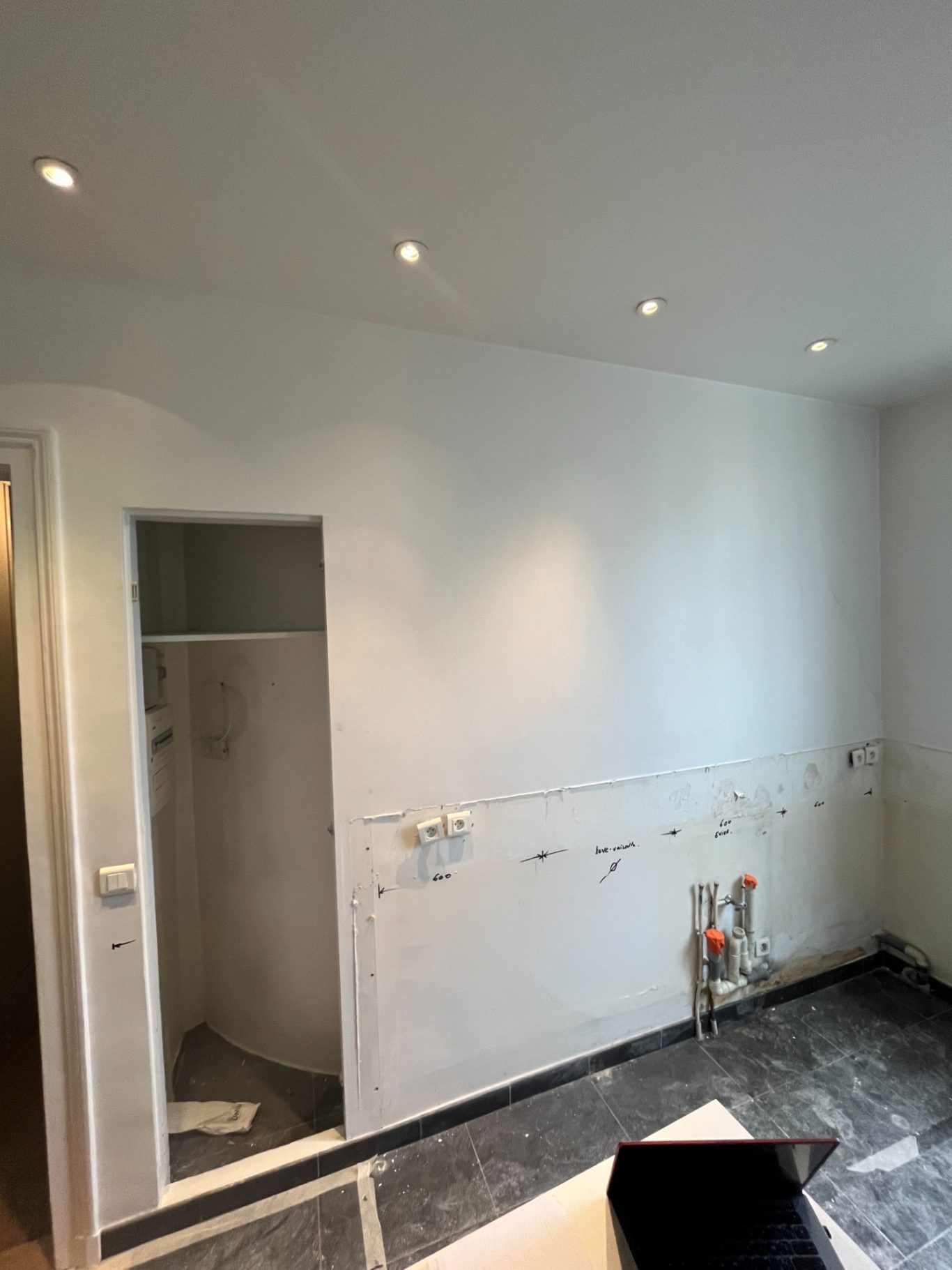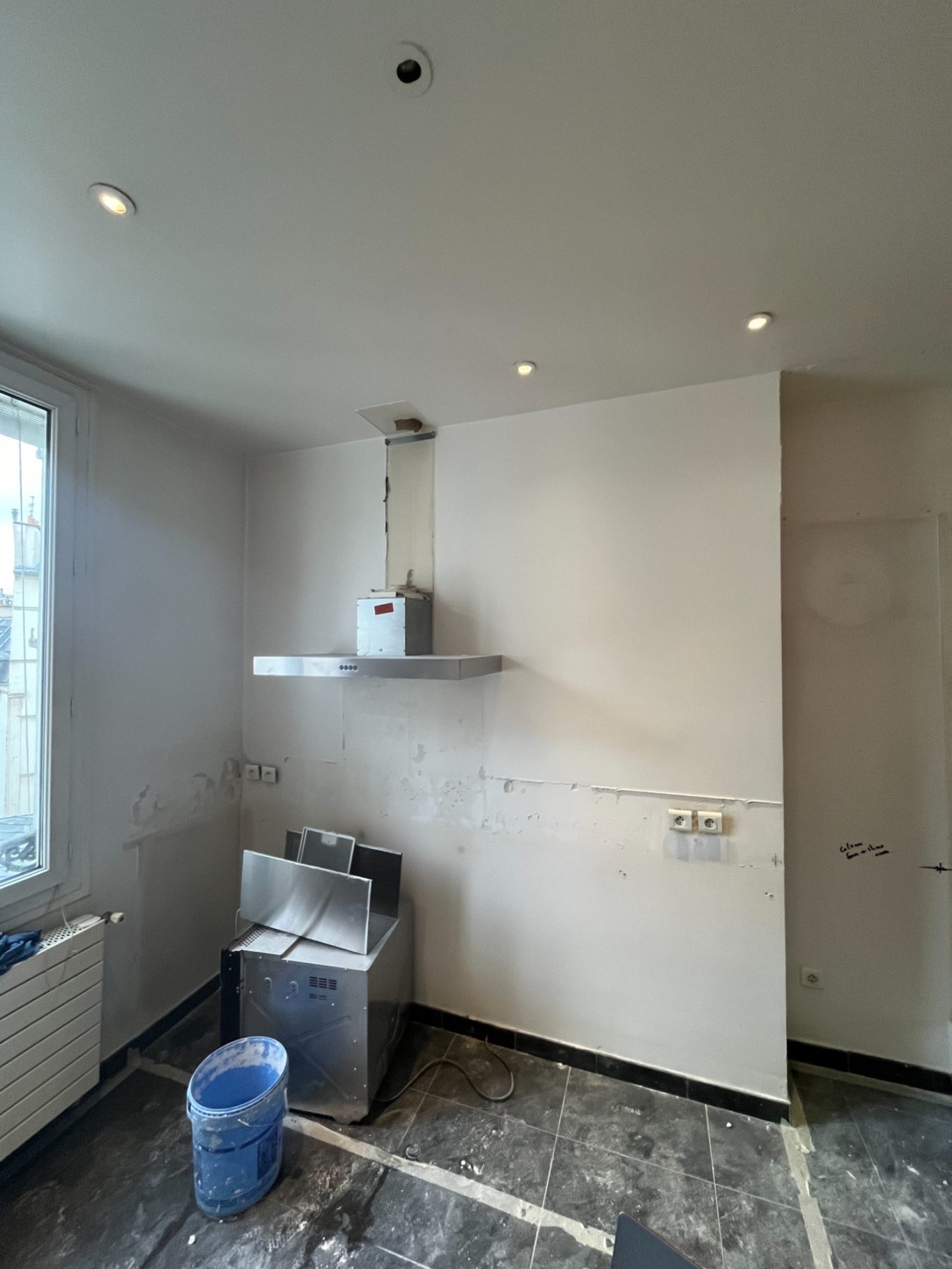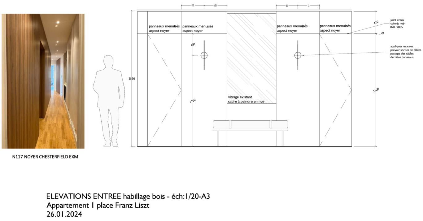 L’intervention consistait à réorganiser un espace de circulation en intégrant, dans un même volume, un accès dissimulé aux toilettes, un couloir et des éléments techniques (radiateurs, conduits, etc.), tout en créant un mur décoratif habillé de noyer, parfaitement intégré à l’ambiance.