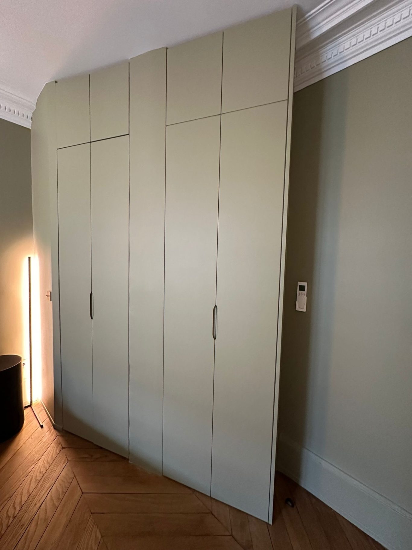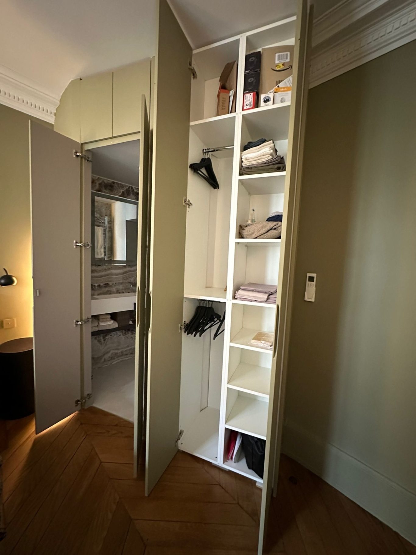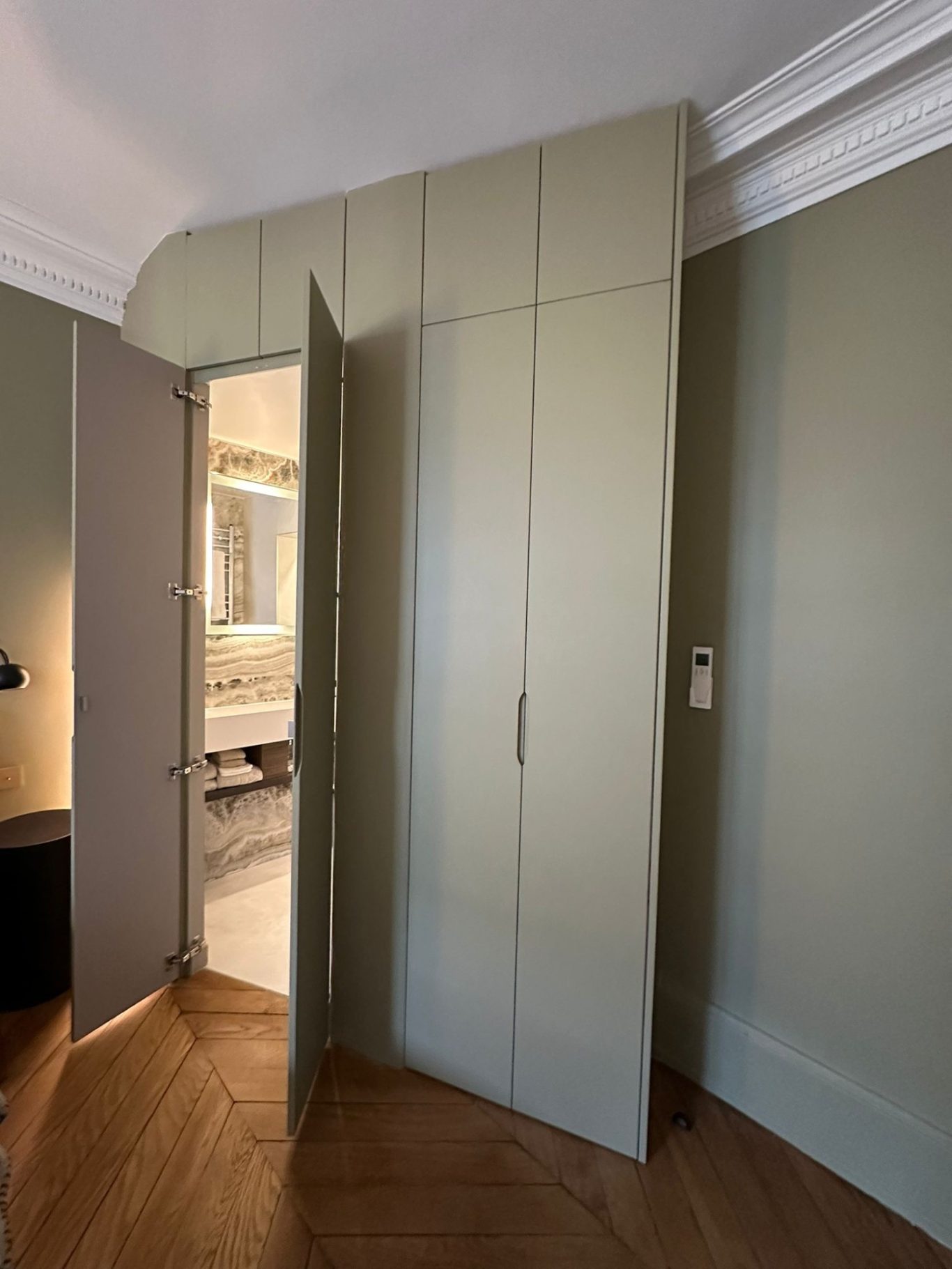 Derrière des façades sur mesure aux lignes épurées, un placard intégralement encastré se déploie : rangements généreux, penderie, et une porte invisible donnant accès à une salle de bain privative, entièrement repensée. L’objectif : offrir un confort complet, dans une enveloppe raffinée, sans rompre la lecture architecturale de la pièce.