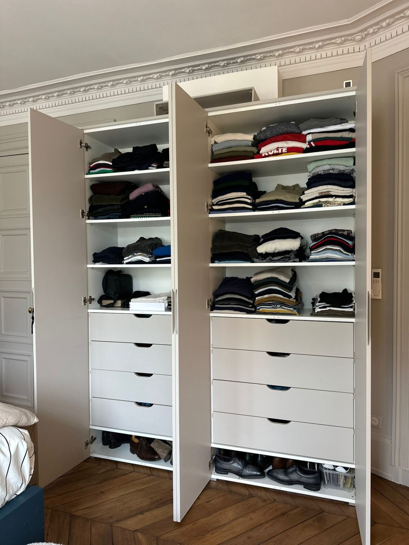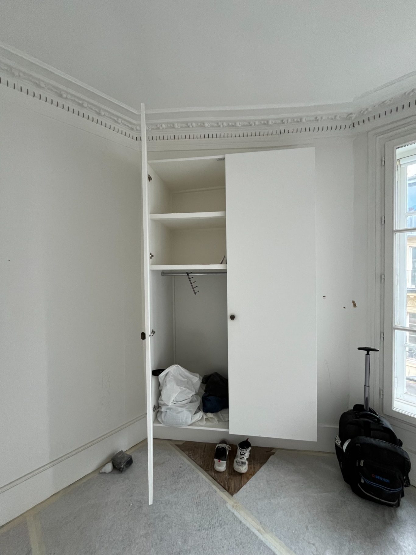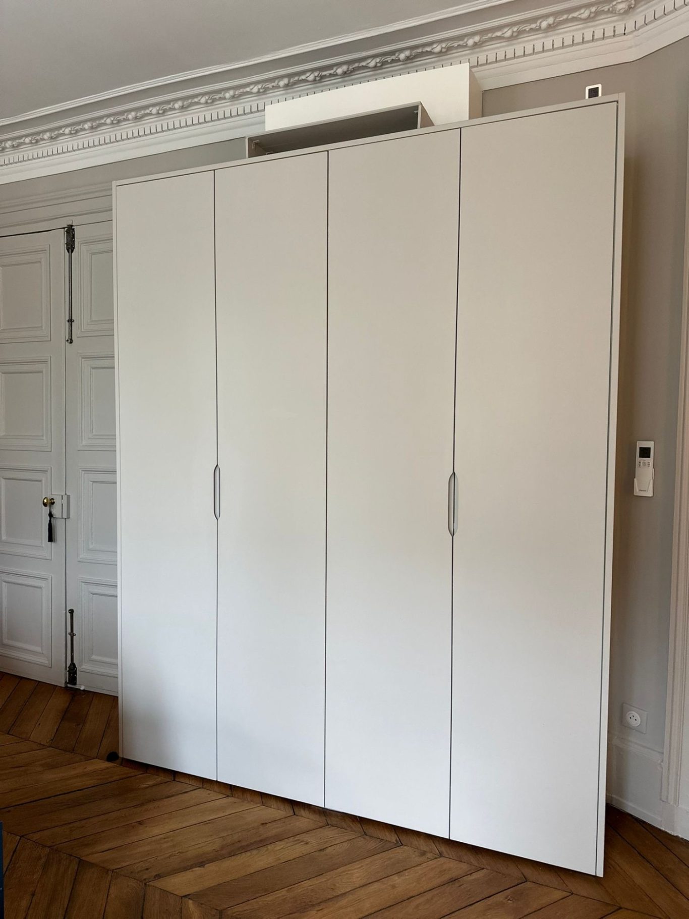 Derrière des façades sur mesure aux lignes épurées, un placard intégralement encastré se déploie : rangements généreux, penderie, et une porte invisible donnant accès à une salle de bain privative, entièrement repensée. L’objectif : offrir un confort complet, dans une enveloppe raffinée, sans rompre la lecture architecturale de la pièce.