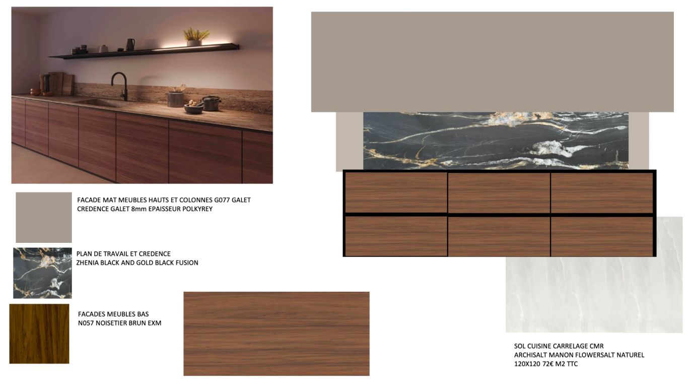 Les façades mates et pleines hauteur dissimulent de vastes rangements intégrés, tandis que les caissons en noyer naturel réchauffent l’ambiance avec raffinement. Les plans de travail en marbre noir veiné soulignent la noblesse des matériaux et l’exigence du détail. L’îlot central suspendu, sculptural et fonctionnel, crée un lien fluide entre espace de préparation et espace de vie.
